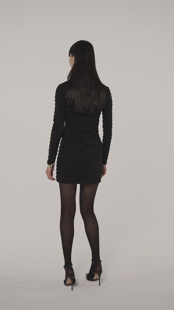 L'abito in maglia jersey lurex è arricchito da alette sulle spalle di raso dettagliate da bottoni logati Monique color oro.