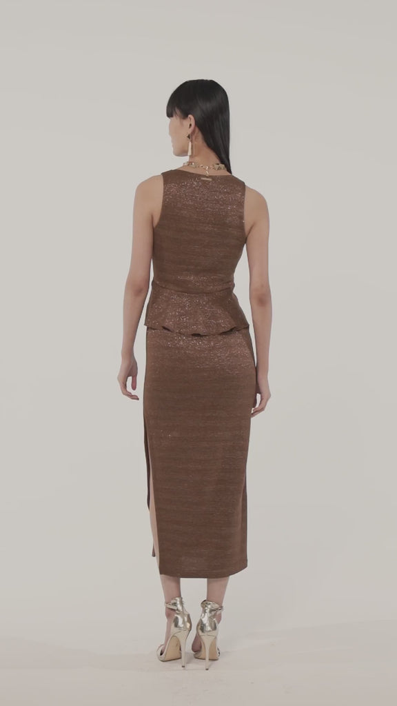 L'abito  in maglia jersey lurex lungo al ginocchio con scollo a V è caratterizzato da rouches sul davanti