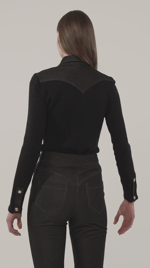 Il modello a camicia è dettagliato da bottoni Monique sulla fintone realizzato in denim.