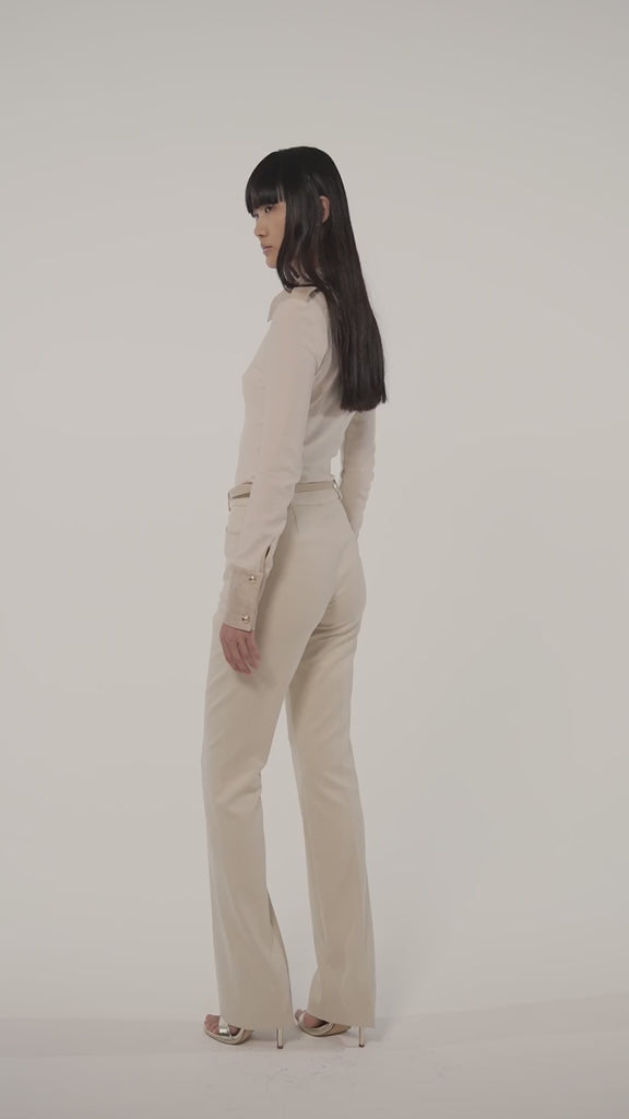 Pantaloni realizzati in poliviscosa mano lana dalla linea a zampetta.