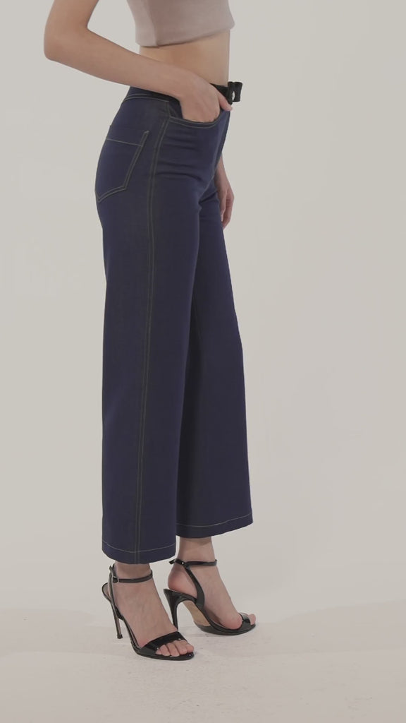Pantaloni formali realizzati in denim, dalla linea palazzo. Il modello è impreziosito