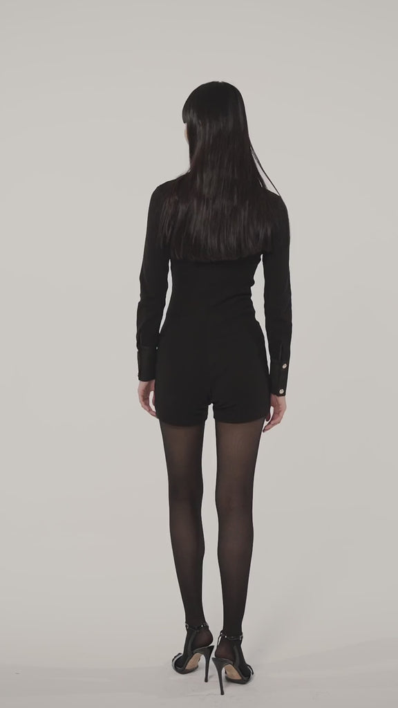 Tutina corta in cotone viscosa aderente, arricchita da un  fintone di raso sul davanti dettagliato