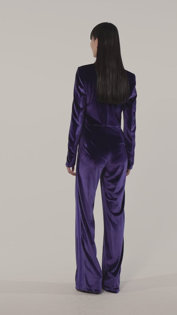 Tuta smoking a maniche lunghe realizzata in velluto elastico con rever a lancia in raso.